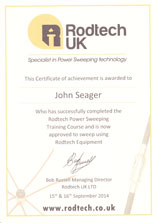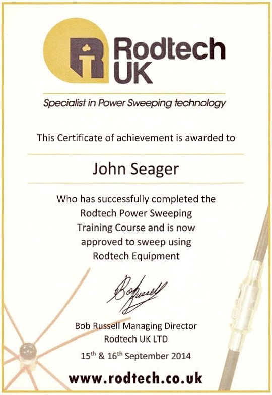John has completed the Rodtech power sweeping training course, thus gaining recognition and approval by Rodtech to use the Rodtech power sweeping equipment which is the only industry approved method for power sweeping.